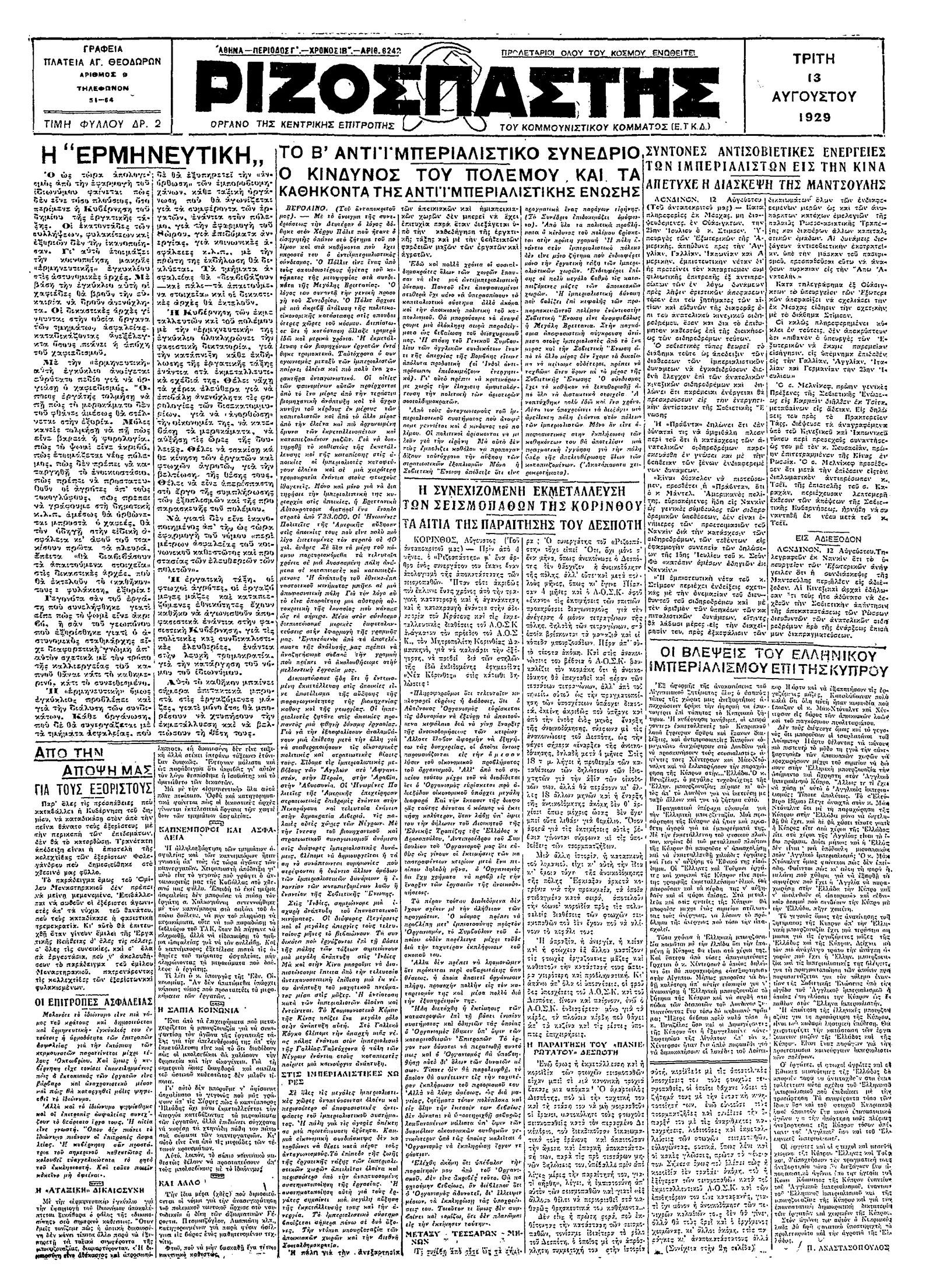 Ριζοσπάστης 13/08/1929