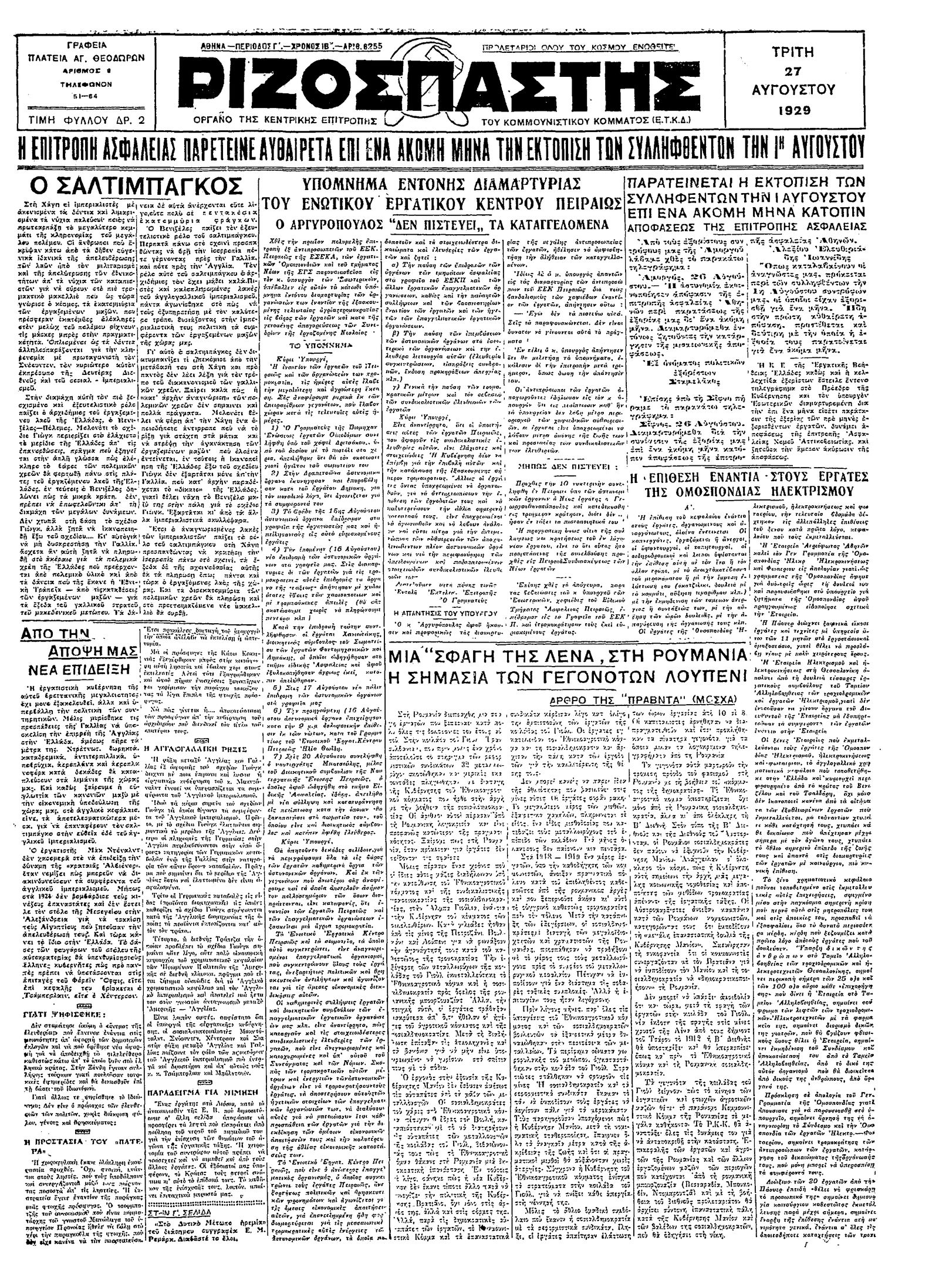 Ριζοσπάστης 27/08/1929