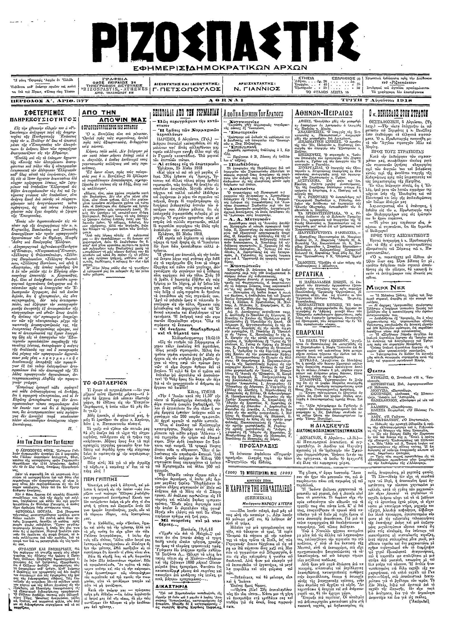 Ριζοσπάστης 07/08/1918